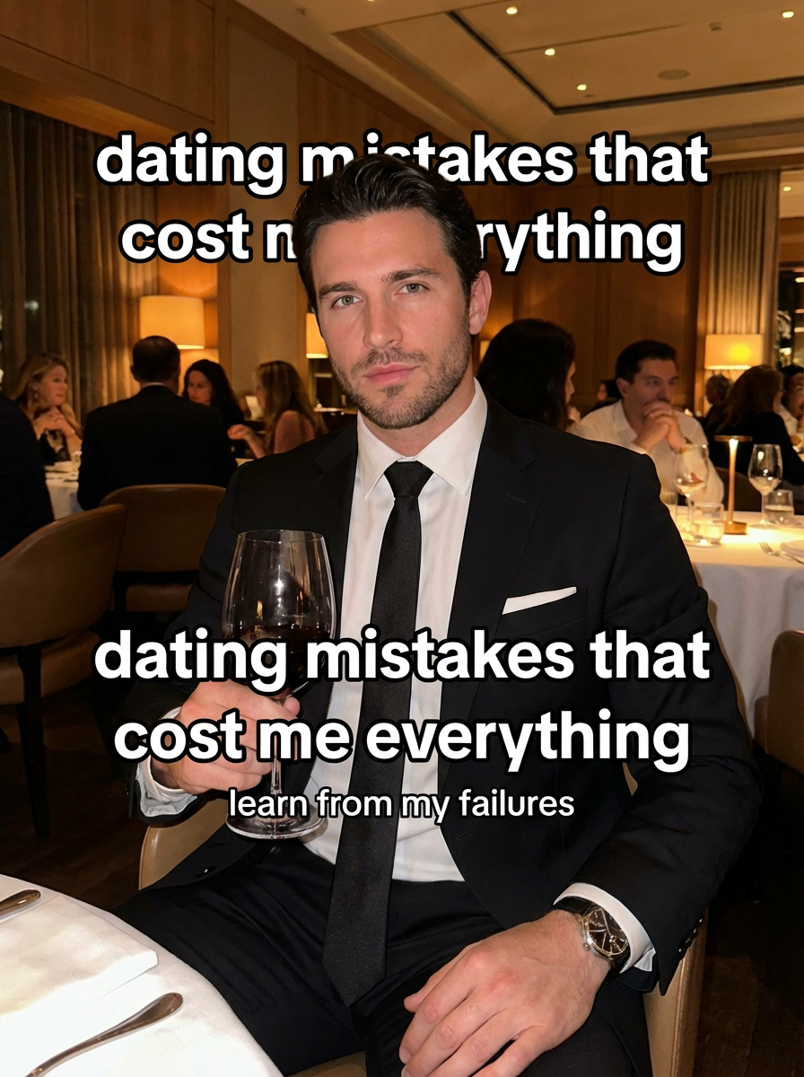 model in sharp black suit at upscale restaurant, dim ambient lighting, wine glass in hand, confident expression. TikTok TikTok-style text overlay with white text with black outline: "dating mistakes that cost me everything" smaller text: "(learn from my failures)", do not show tiktok interface or logo