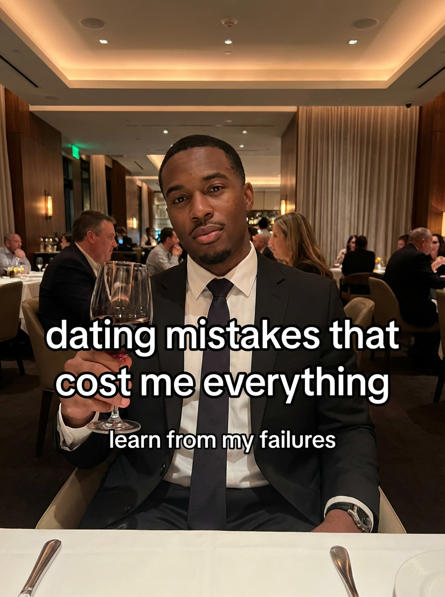 model in sharp black suit at upscale restaurant, dim ambient lighting, wine glass in hand, confident expression. TikTok TikTok-style text overlay with white text with black outline: "dating mistakes that cost me everything" smaller text: "(learn from my failures)", do not show tiktok interface or logo