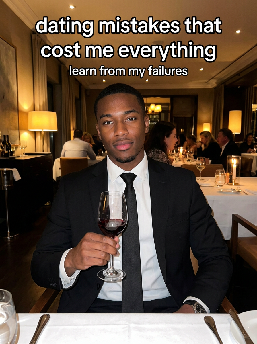 model in sharp black suit at upscale restaurant, dim ambient lighting, wine glass in hand, confident expression. TikTok-style text overlay with white text with black outline: "dating mistakes that cost me everything" smaller text: "(learn from my failures)", do not show tiktok interface or logo