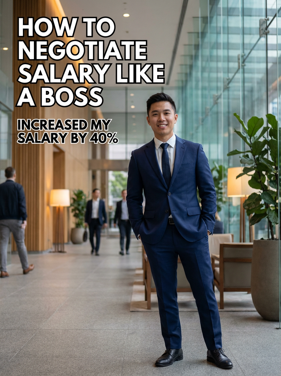 model in sharp business attire in office building lobby, confident posture, professional lighting. TikTok TikTok-style text overlay with white text with black outline: "how to negotiate salary like a boss" smaller text: "(increased my salary by 40%)", do not show tiktok interface or logo