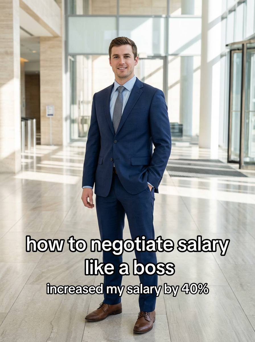 model in sharp business attire in office building lobby, confident posture, professional lighting. TikTok TikTok-style text overlay with white text with black outline: "how to negotiate salary like a boss" smaller text: "(increased my salary by 40%)", do not show tiktok interface or logo