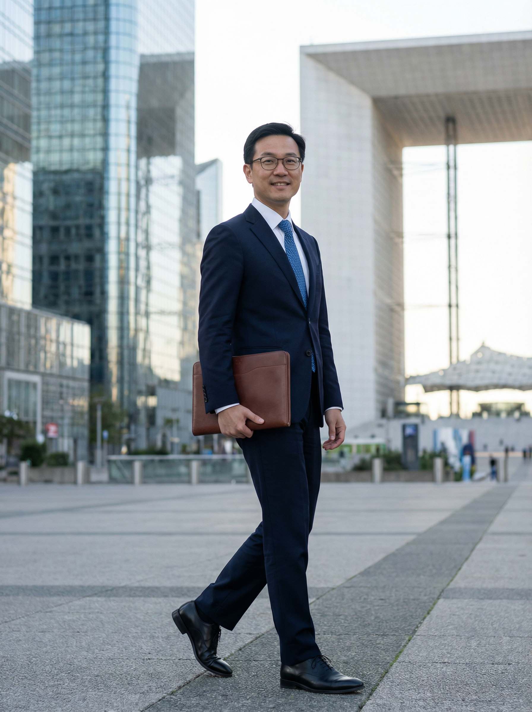 model in sharp business suit, tie, dress shoes, leather portfolio in La Défense business district, modern skyscrapers, glass architecture, professional atmosphere, urban business setting, contemporary Paris