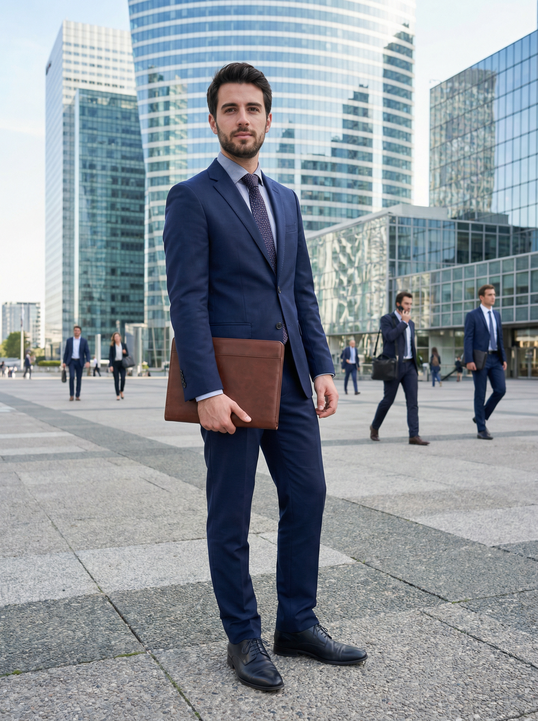 model in sharp business suit, tie, dress shoes, leather portfolio in La Défense business district, modern skyscrapers, glass architecture, professional atmosphere, urban business setting, contemporary Paris