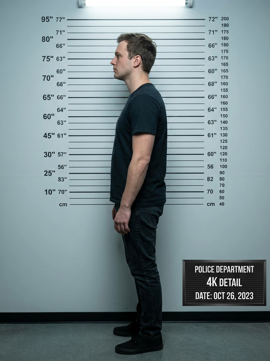 model in side profile mugshot, booking photo style, neutral expression, measurement backdrop