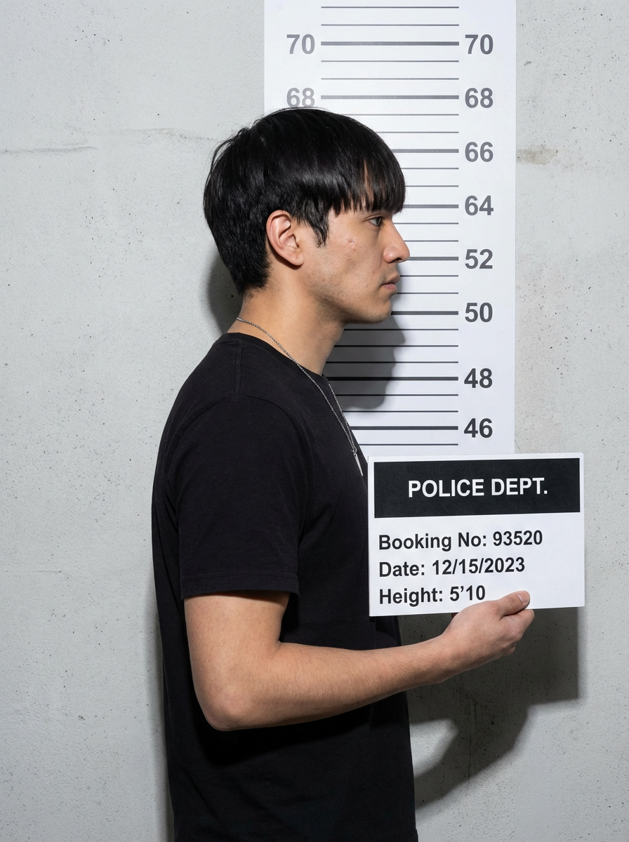 model in side profile mugshot, booking photo style, neutral expression, measurement backdrop