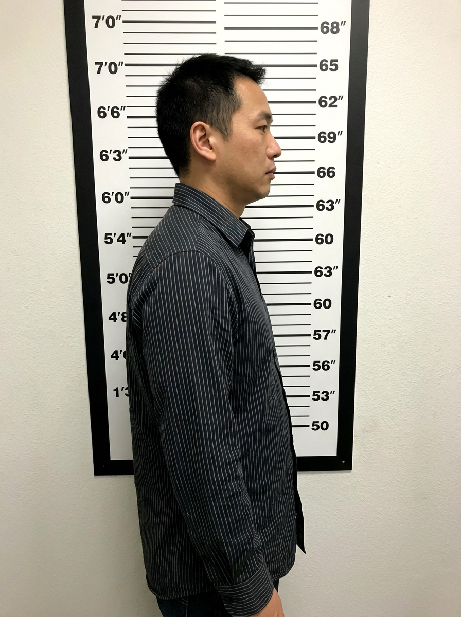 model in side profile mugshot, booking photo style, neutral expression, measurement backdrop