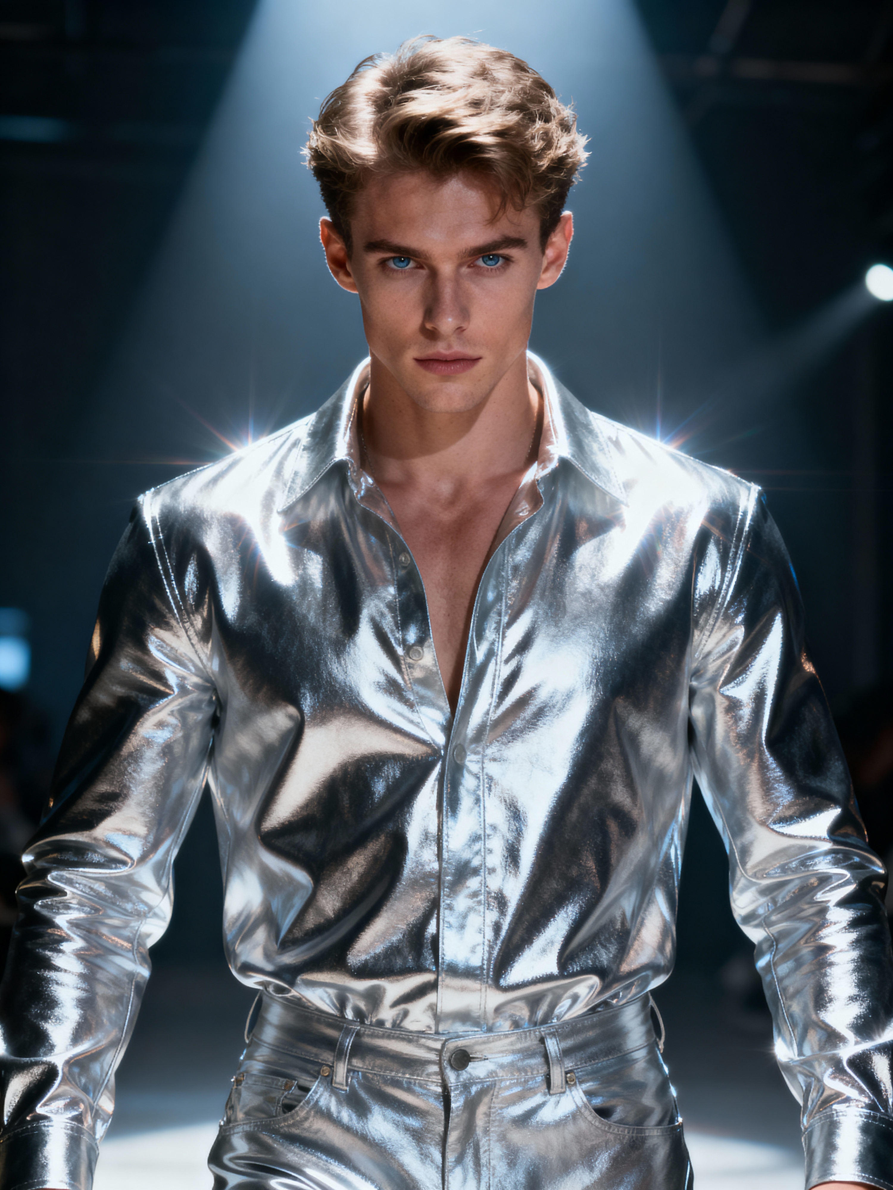 model in silver metallic glossy style, wearing shiny glossy metallic glossy fashion