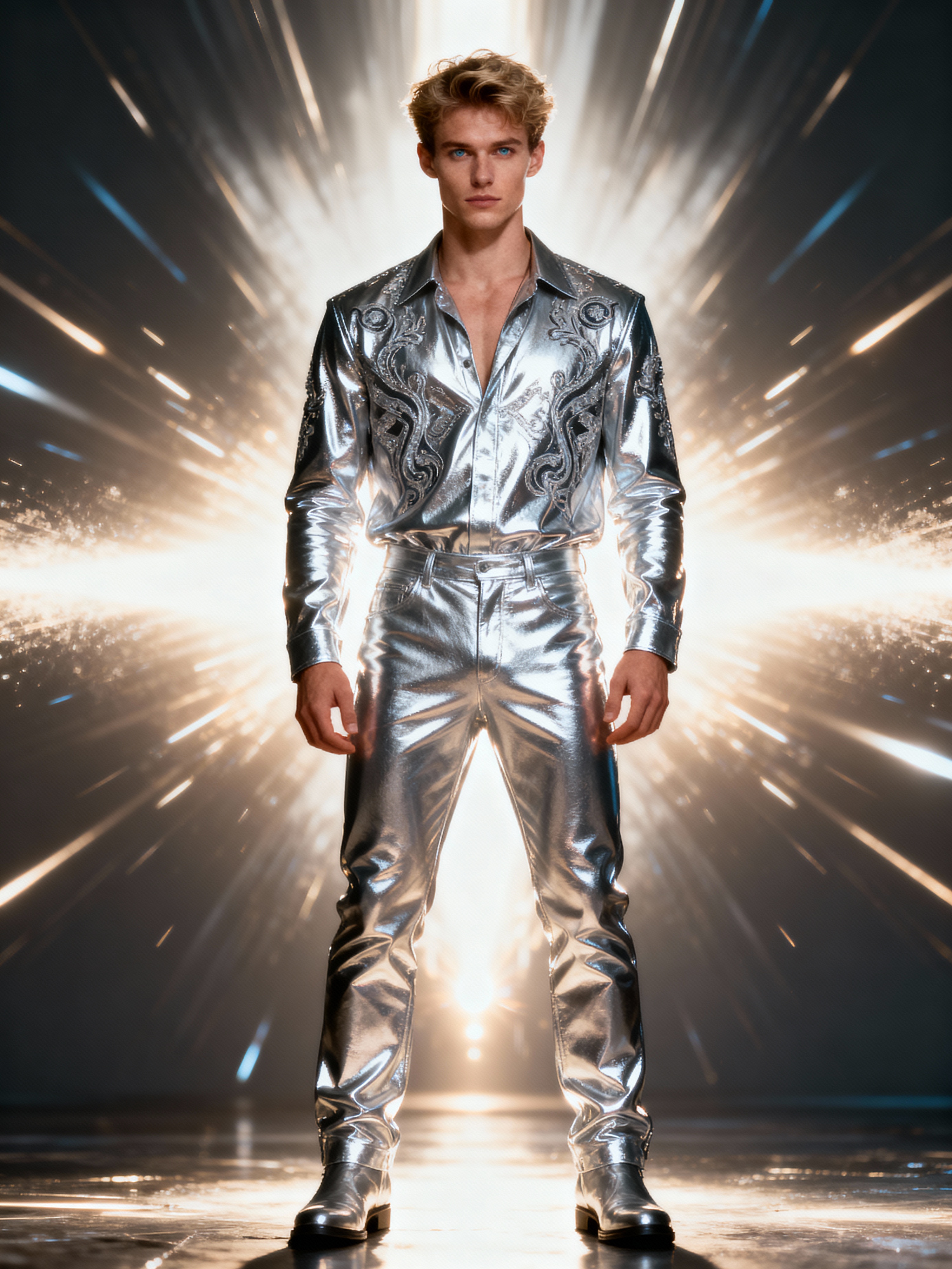 model in silver metallic glossy style, wearing shiny glossy metallic glossy fashion