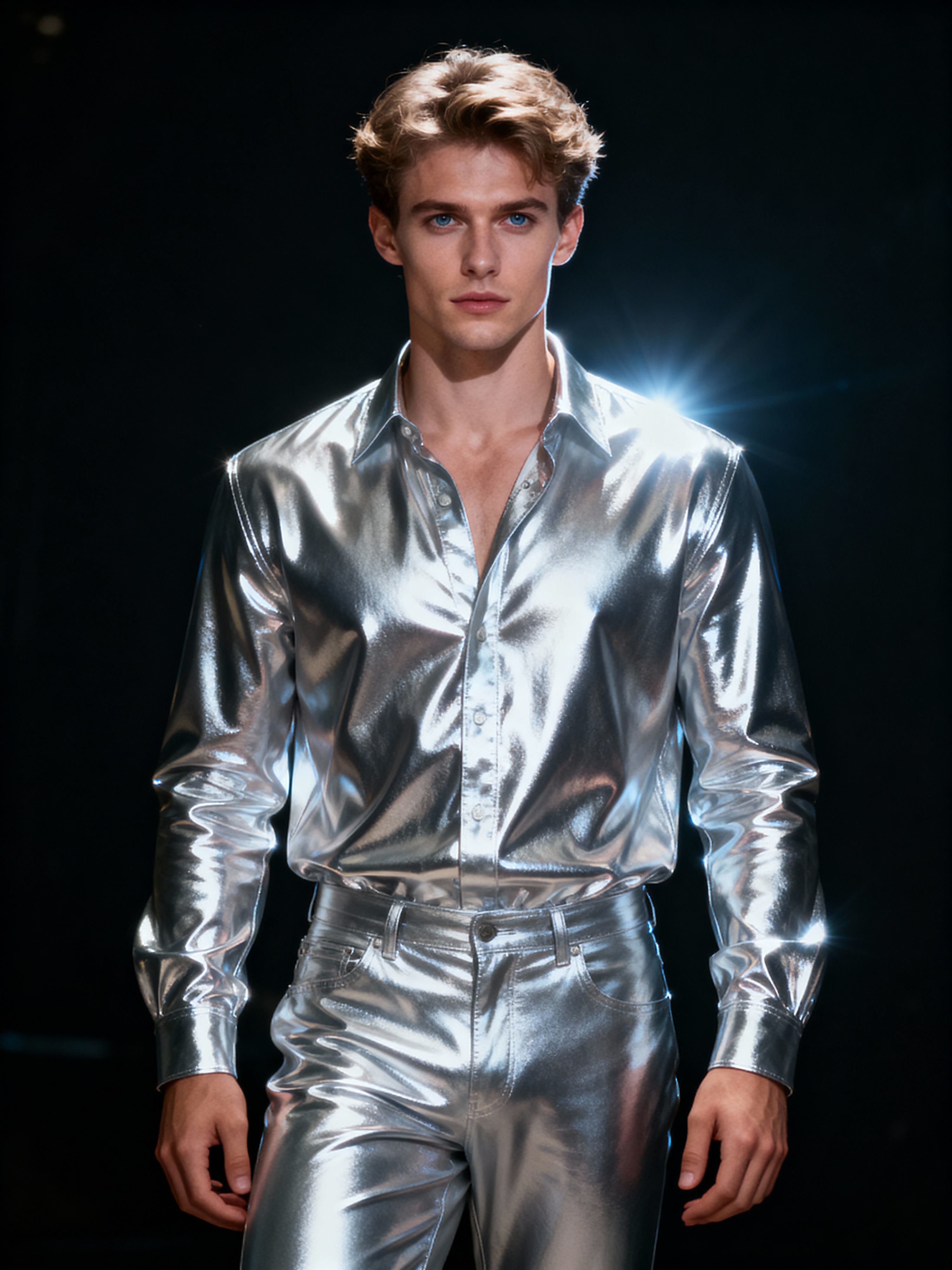 model in silver metallic glossy style, wearing shiny glossy metallic glossy fashion