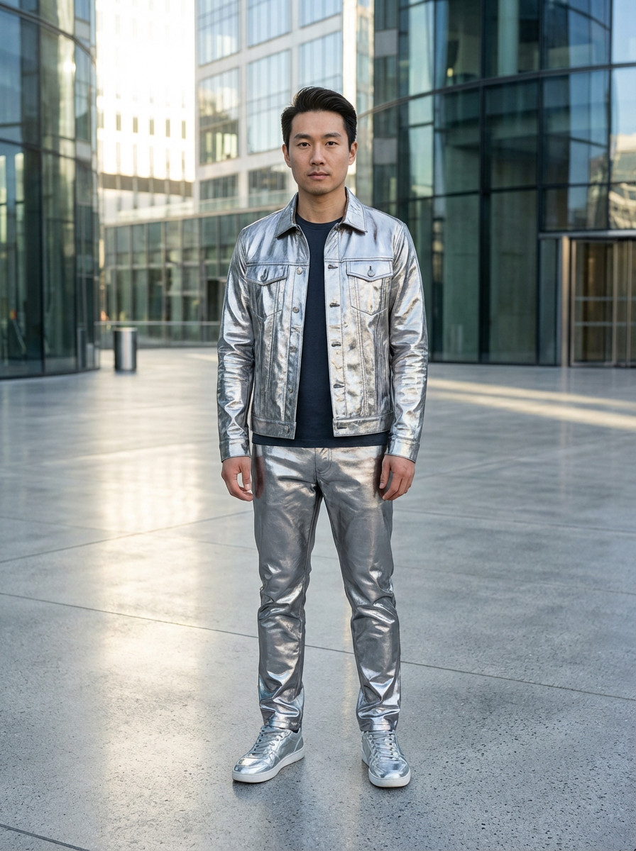 model in silver metallic glossy style, wearing shiny glossy metallic glossy fashion