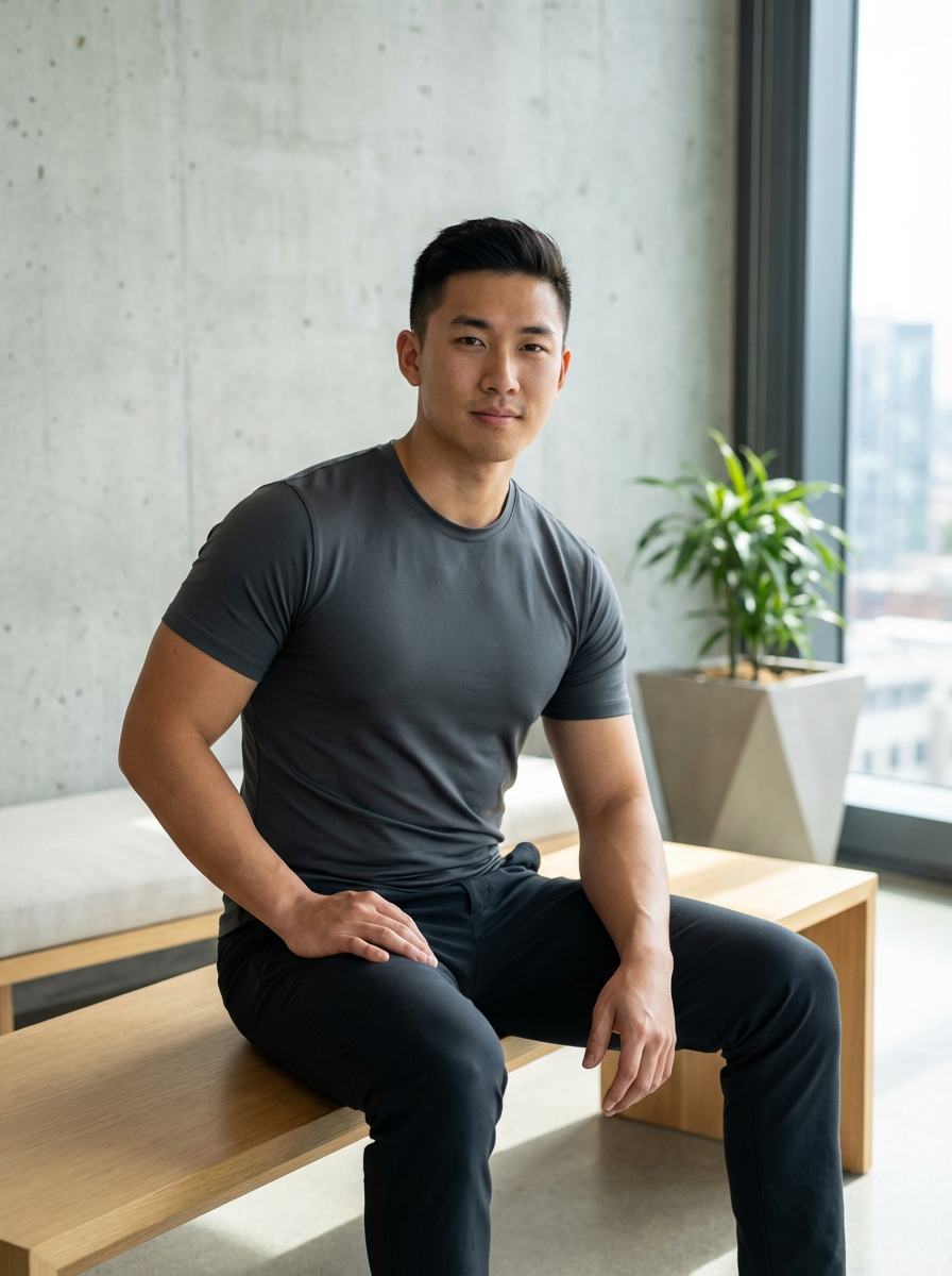 model in sleek fitted shirt, arms showing, confident seated pose, modern minimalist setting