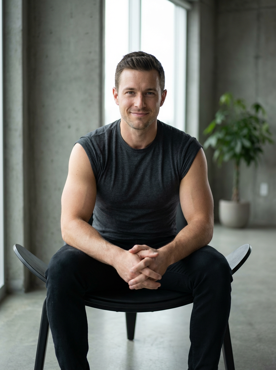 model in sleek fitted shirt, arms showing, confident seated pose, modern minimalist setting