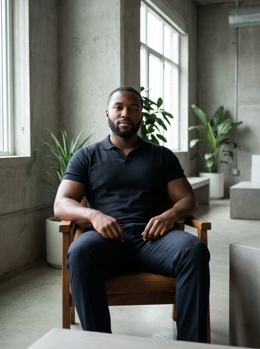 model in sleek fitted shirt, arms showing, confident seated pose, modern minimalist setting
