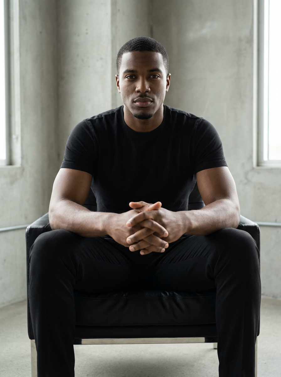 model in sleek fitted shirt, arms showing, confident seated pose, modern minimalist setting