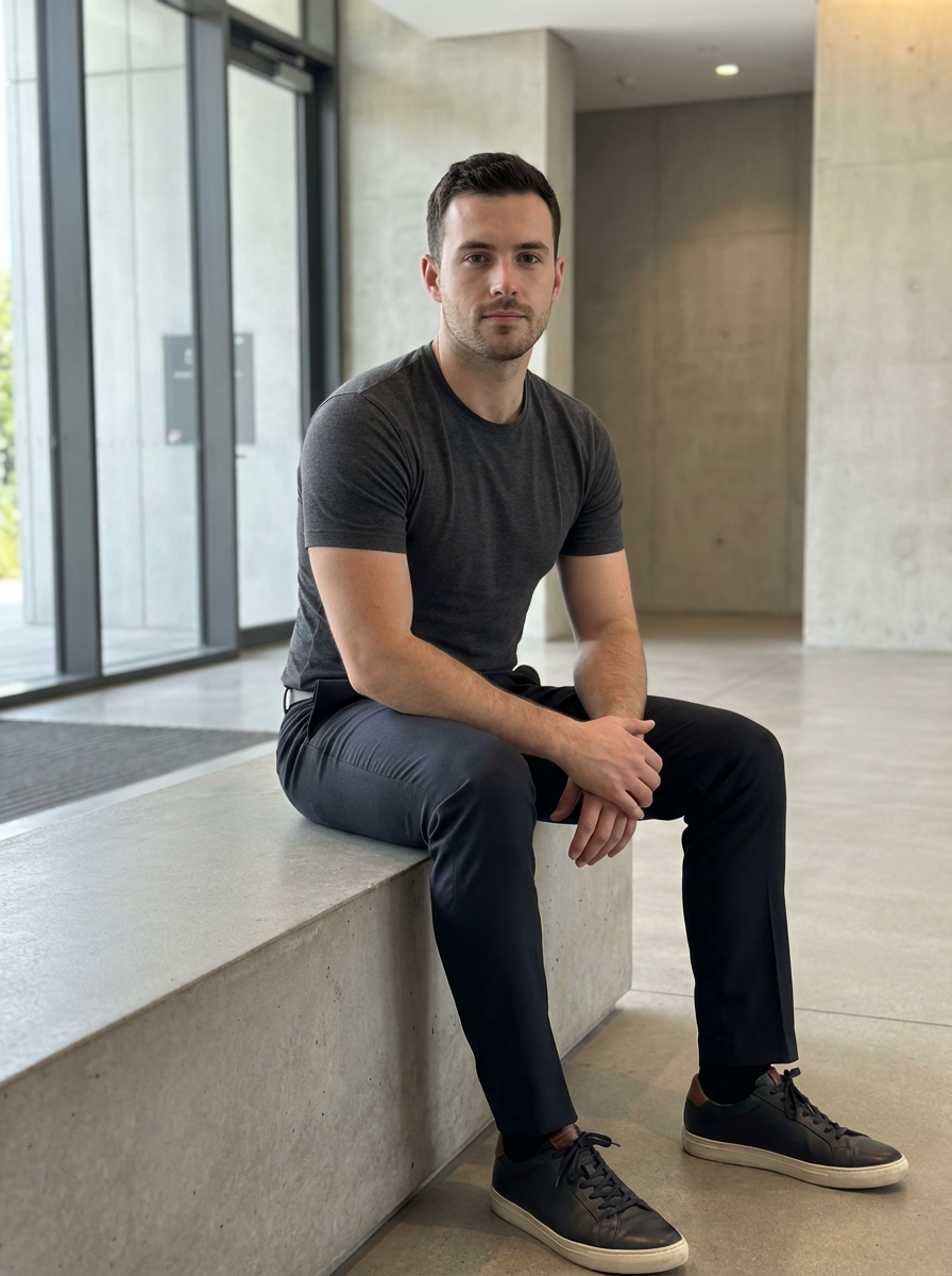 model in sleek fitted shirt, arms showing, confident seated pose, modern minimalist setting