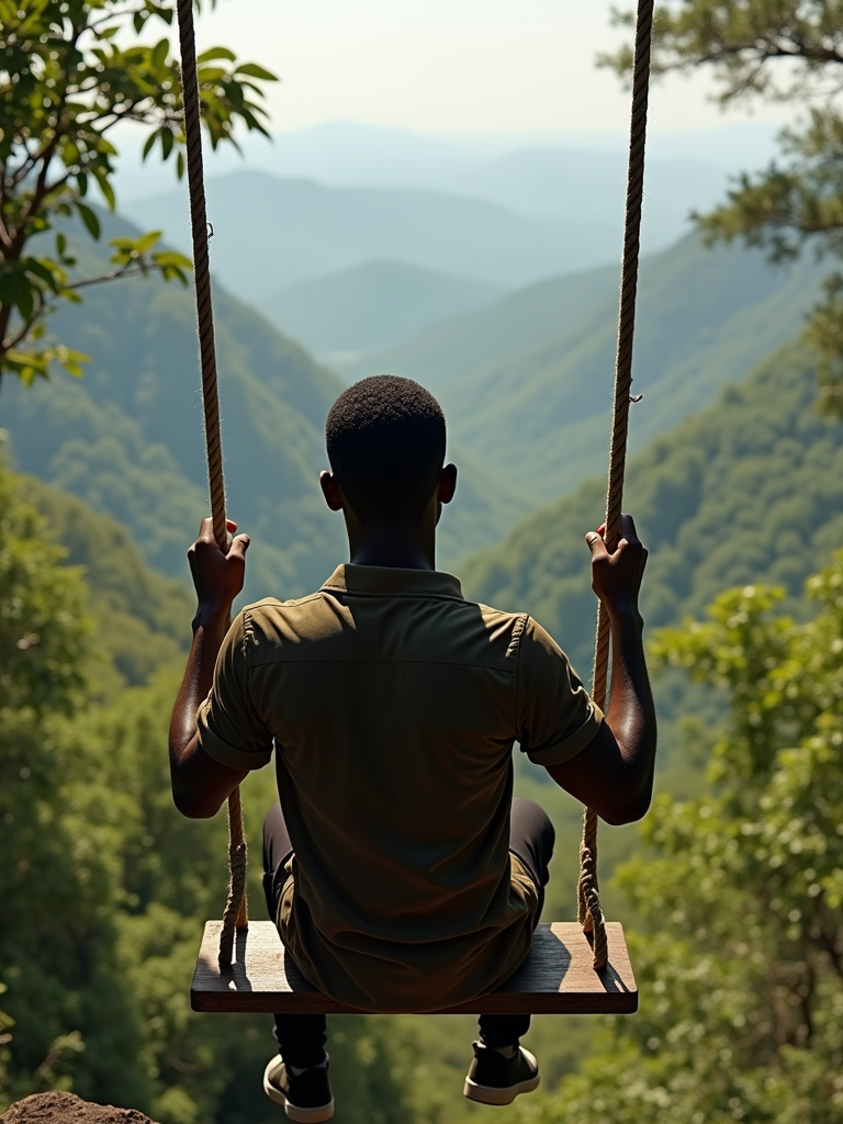 model in smart casual outfit at jungle swing with vast valley view, dramatic lighting