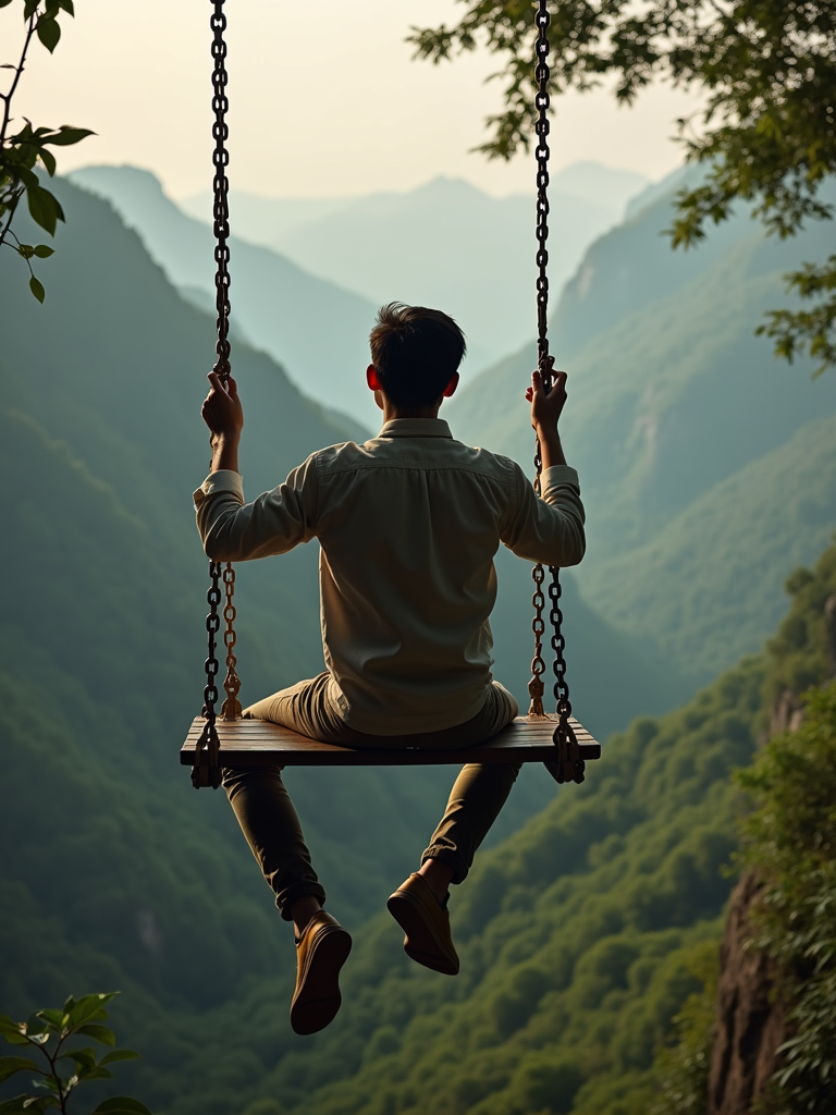 model in smart casual outfit at jungle swing with vast valley view, dramatic lighting
