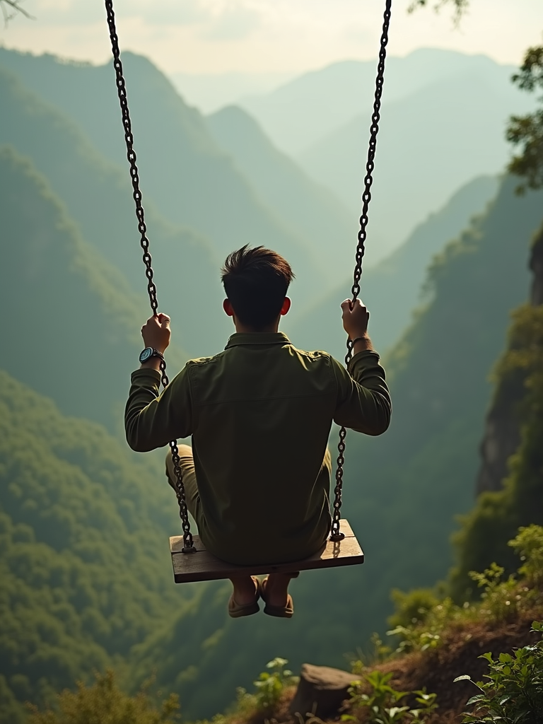 model in smart casual outfit at jungle swing with vast valley view, dramatic lighting