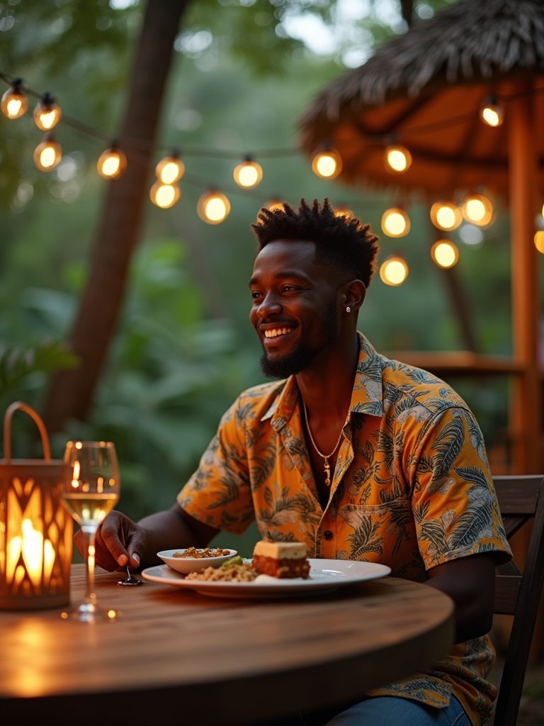 model in smart casual tropical outfit dining at luxury treehouse restaurant in jungle setting, fairy lights and lanterns