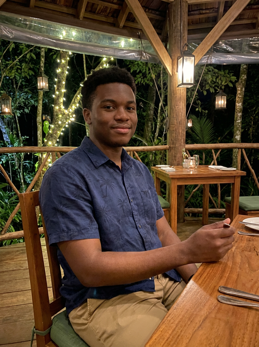 model in smart casual tropical outfit dining at luxury treehouse restaurant in jungle setting, fairy lights and lanterns