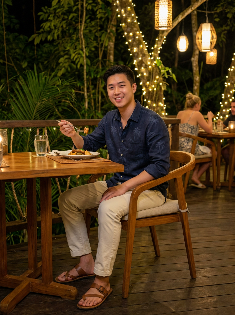 model in smart casual tropical outfit dining at luxury treehouse restaurant in jungle setting, fairy lights and lanterns