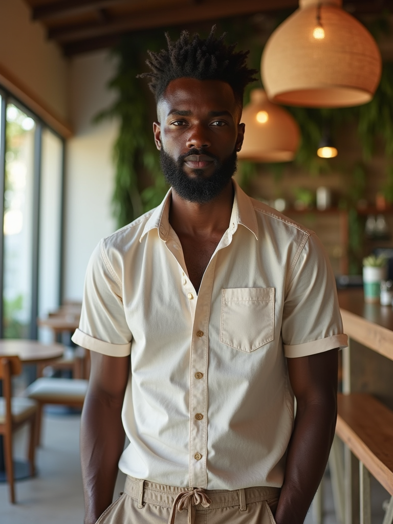 model in smart casual wear at trendy Canggu cafe with tropical minimalist decor