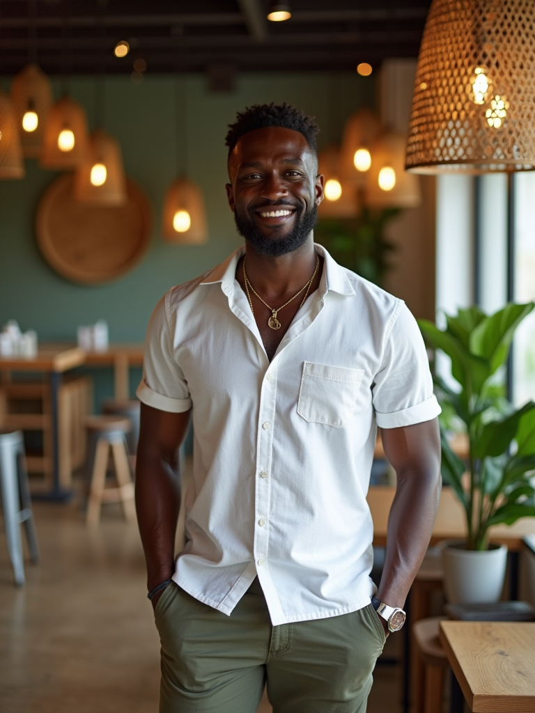 model in smart casual wear at trendy Canggu cafe with tropical minimalist decor