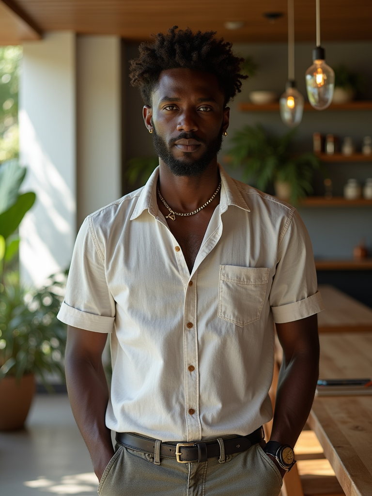 model in smart casual wear at trendy Canggu cafe with tropical minimalist decor