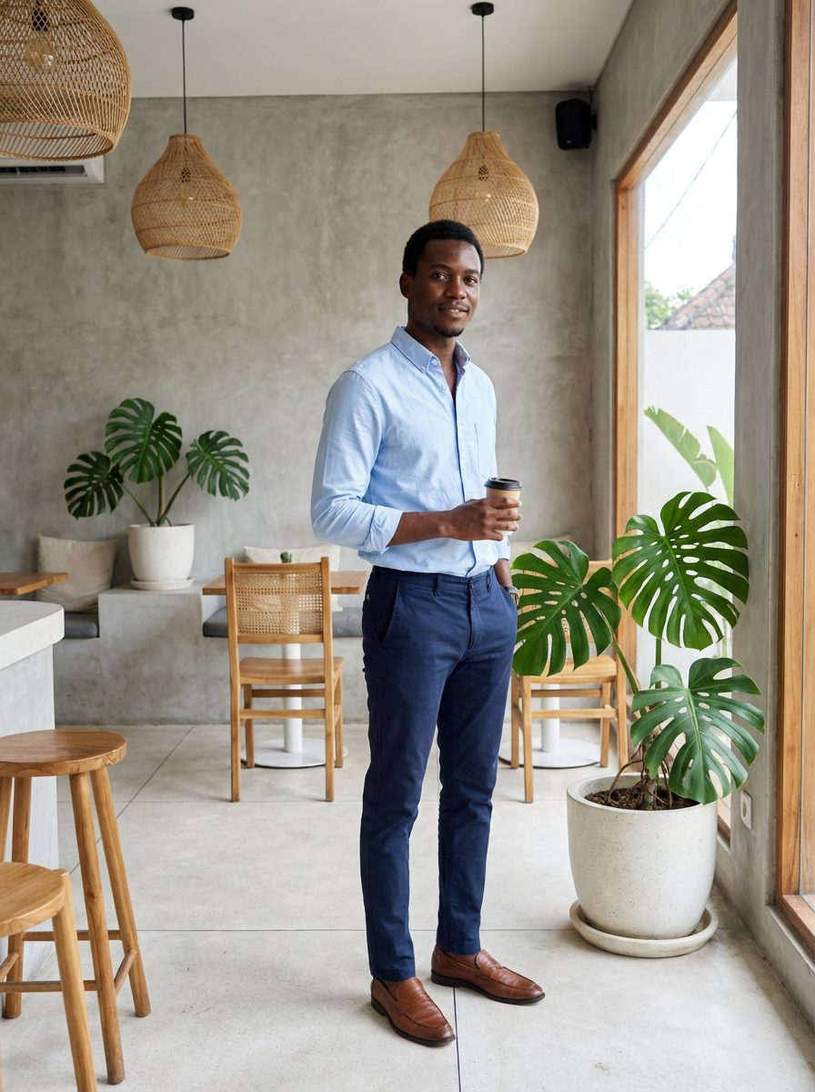 model in smart casual wear at trendy Canggu cafe with tropical minimalist decor