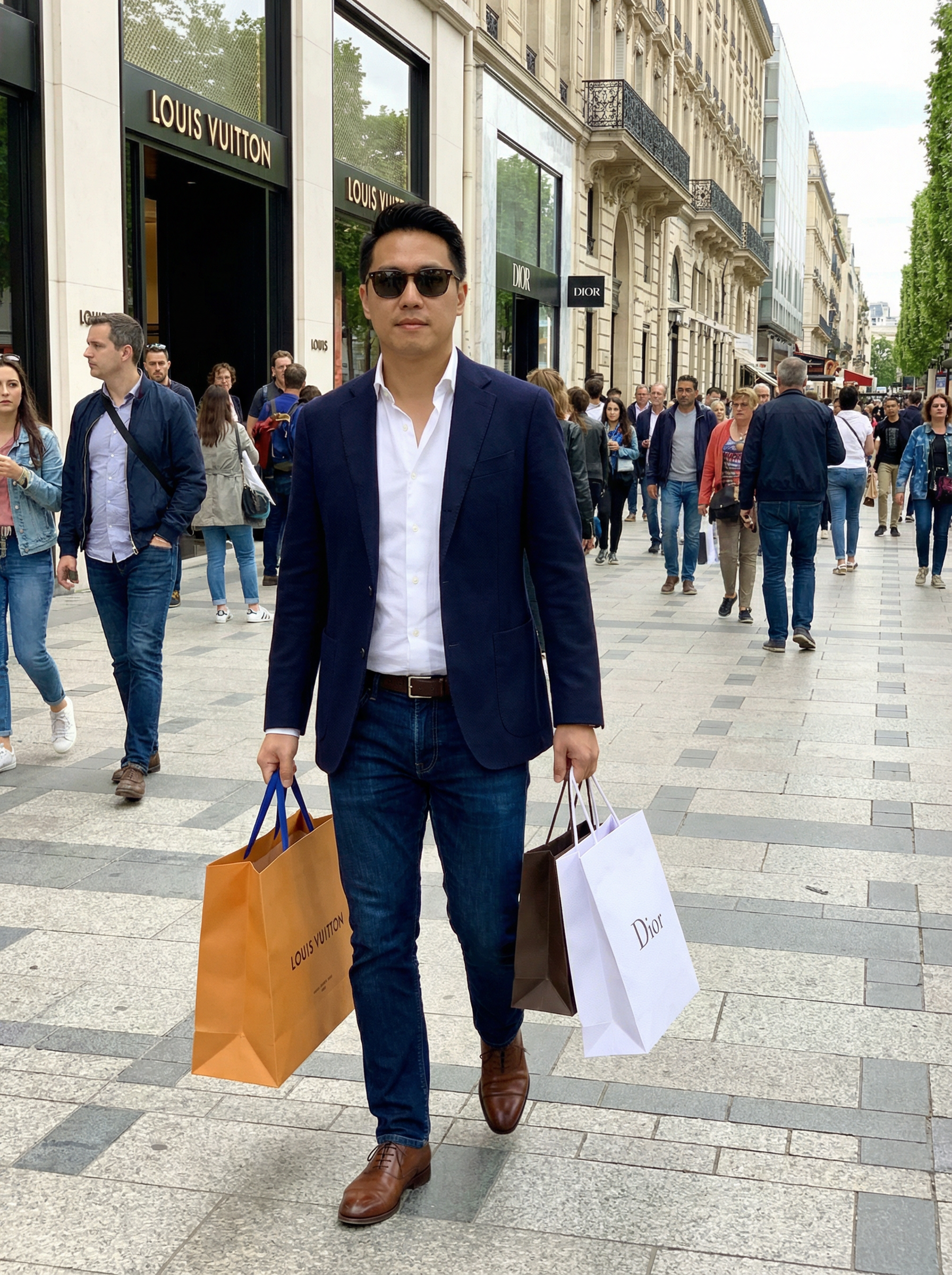 model in sport coat, dark jeans, dress shoes, sunglasses shopping on Champs-Élysées with luxury boutiques in background, fashionable shopping district, busy street life, elegant window displays, sophisticated urban style
