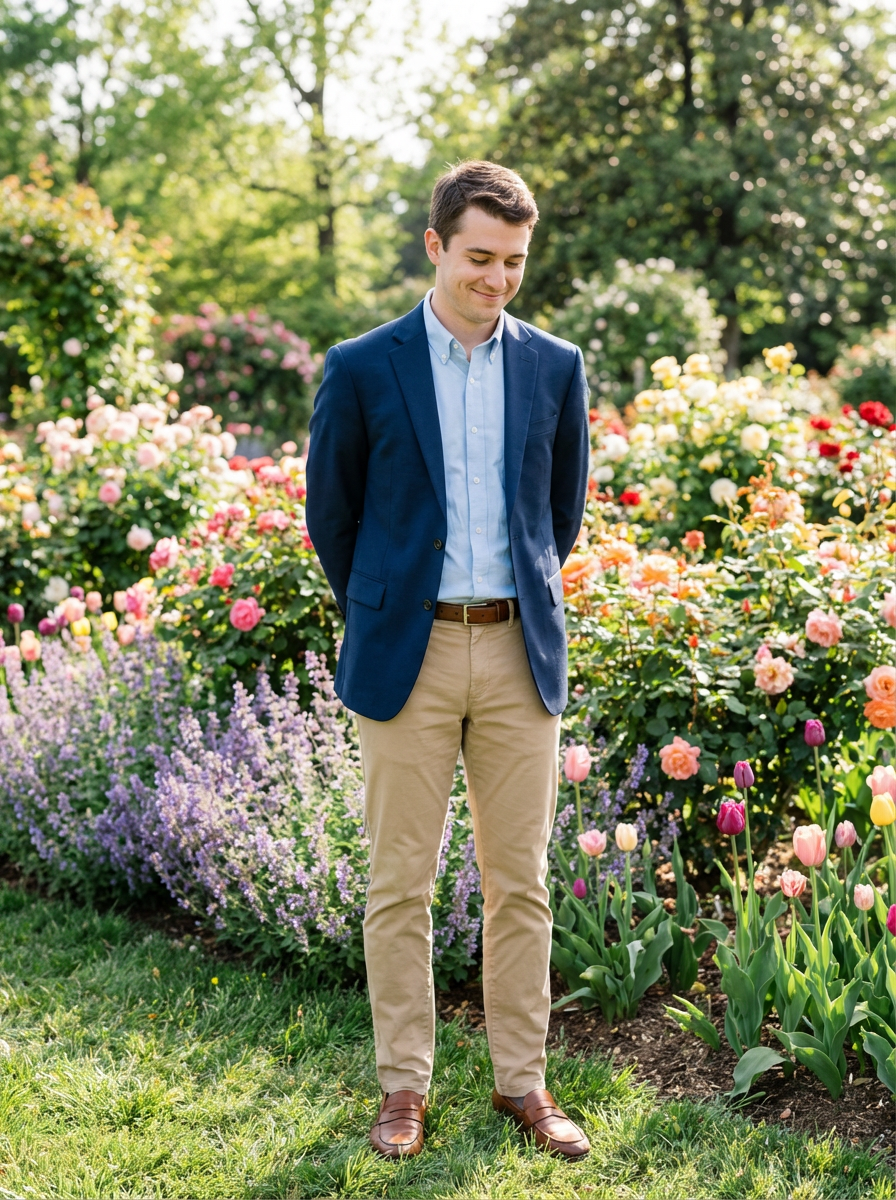 model in spring garden, surrounded by blooming flowers, smart casual, peaceful moment