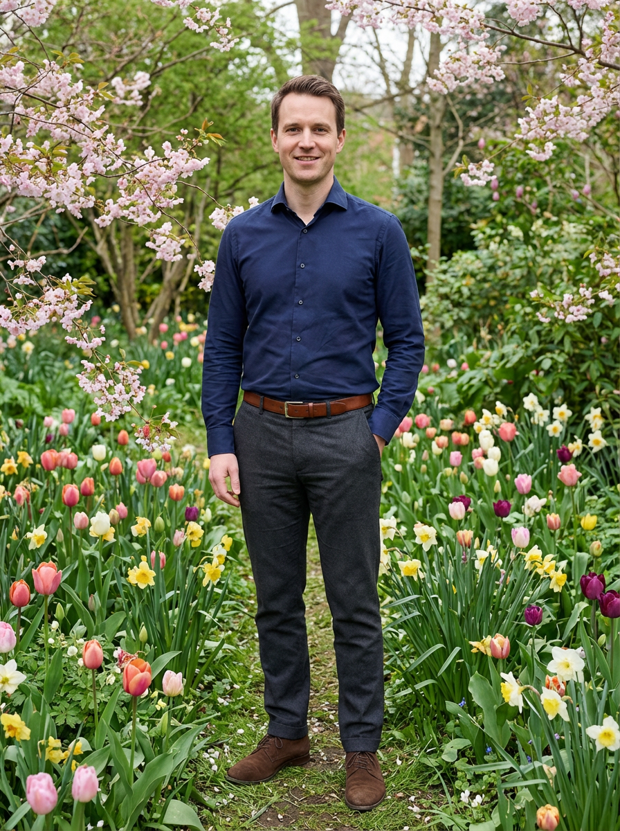 model in spring garden, surrounded by blooming flowers, smart casual, peaceful moment