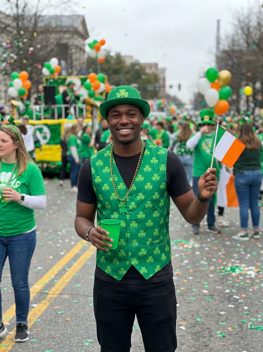 model in St Patricks Day outfit, wearing green, shamrock accessories, festive parade background, fun celebration