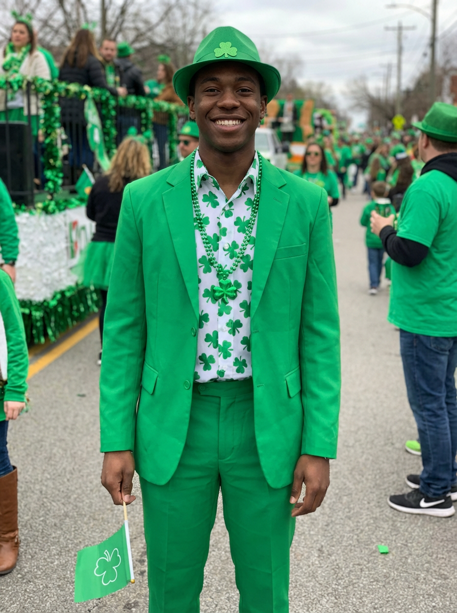 model in St Patricks Day outfit, wearing green, shamrock accessories, festive parade background, fun celebration