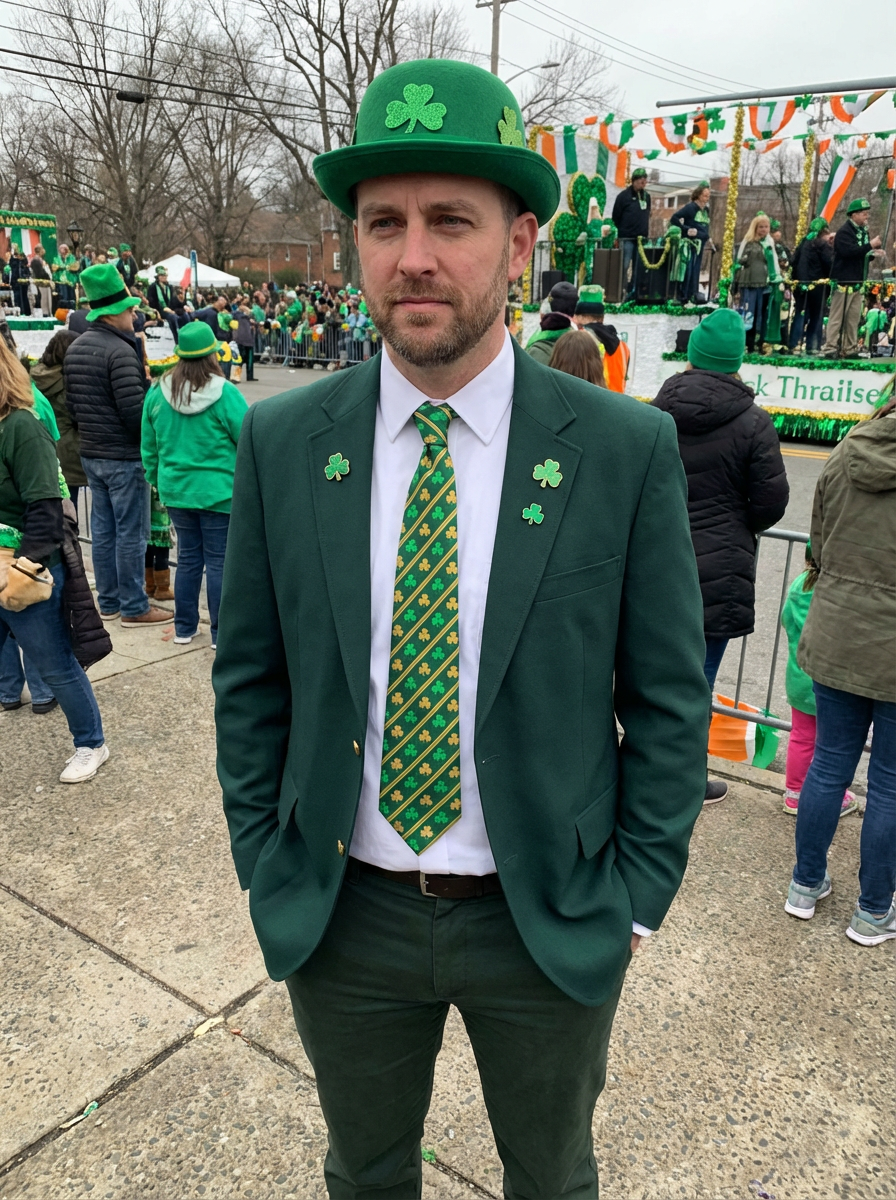 model in St Patricks Day outfit, wearing green, shamrock accessories, festive parade background, fun celebration