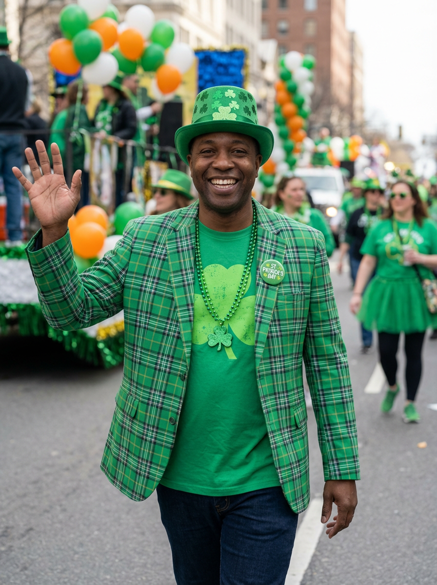 model in St Patricks Day outfit, wearing green, shamrock accessories, festive parade background, fun celebration