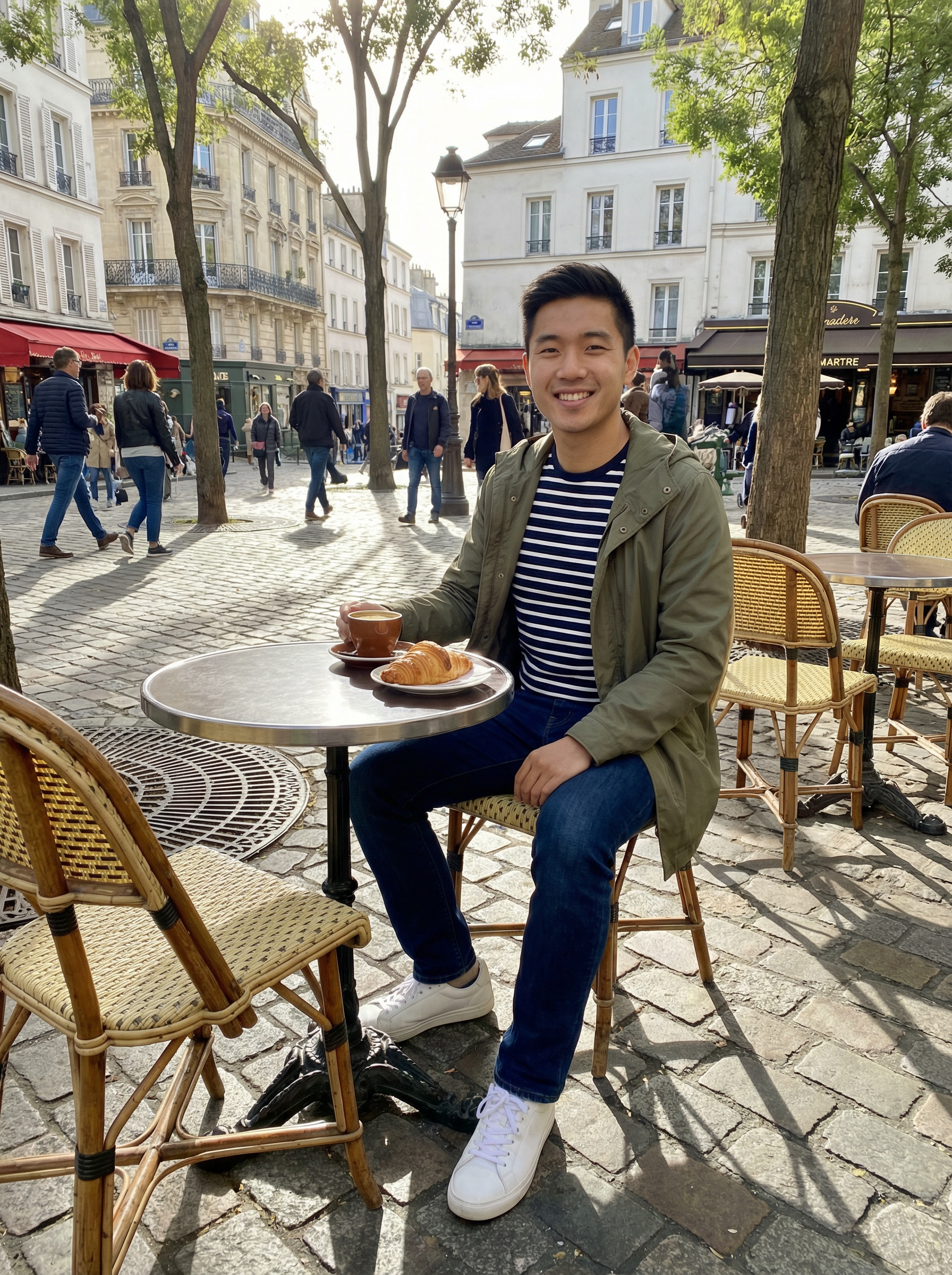 model in striped shirt, dark jeans, white sneakers, light jacket sitting at sidewalk café table with croissant and coffee, charming Montmartre street scene, cobblestone streets, vintage café chairs, warm morning light, authentic Parisian café culture