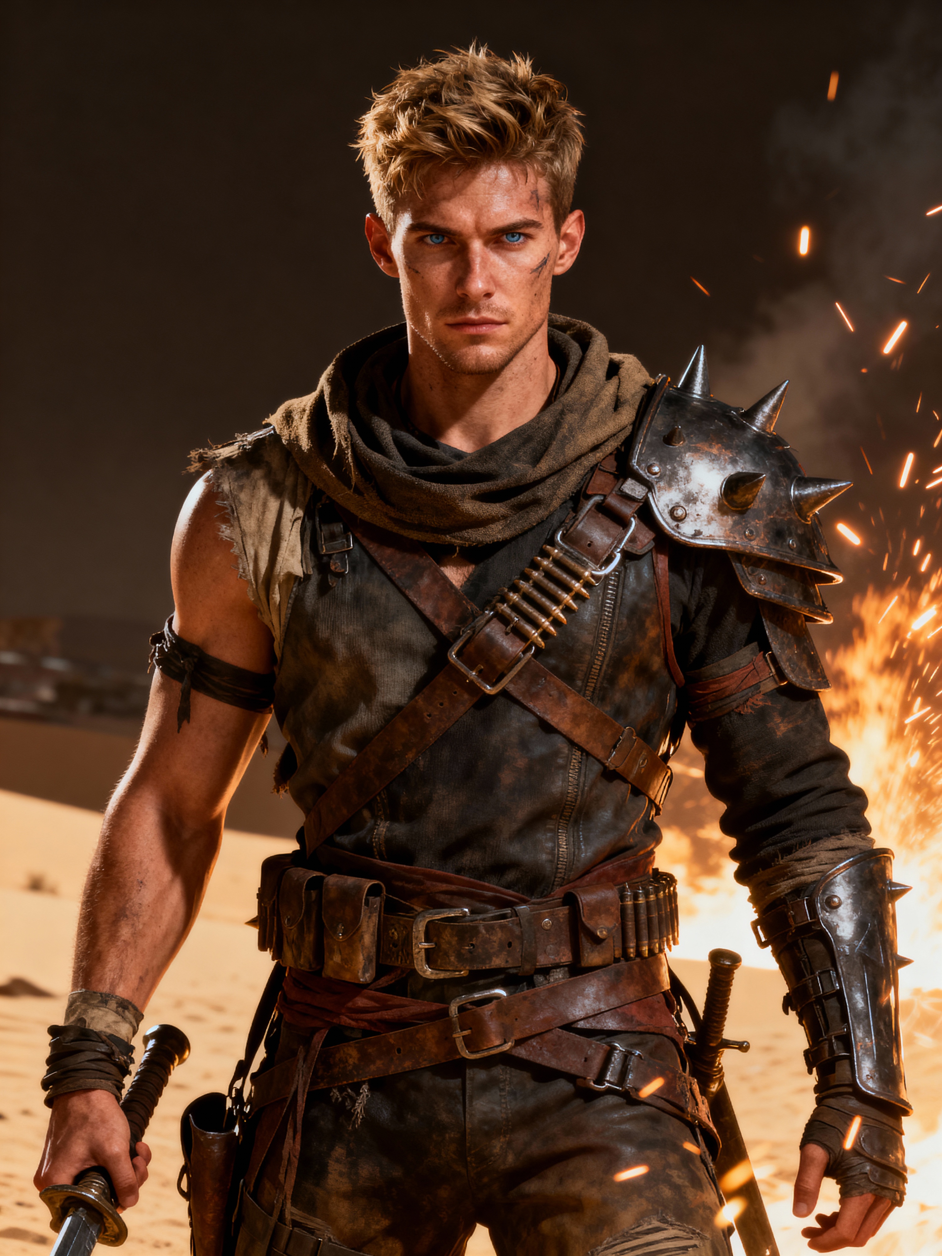 model in style of mad max warrior in desert _ unreal _ 5 _ daz. _ rpg _ shot _ extremely _ detailed _ artgerm _ greg _ rutkowski _ greg