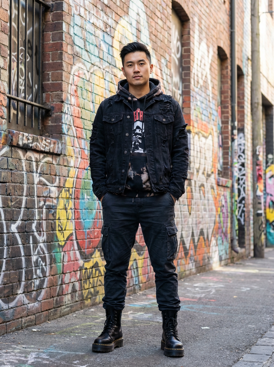 model in stylish alternative fashion, confident self-expression, urban artistic background