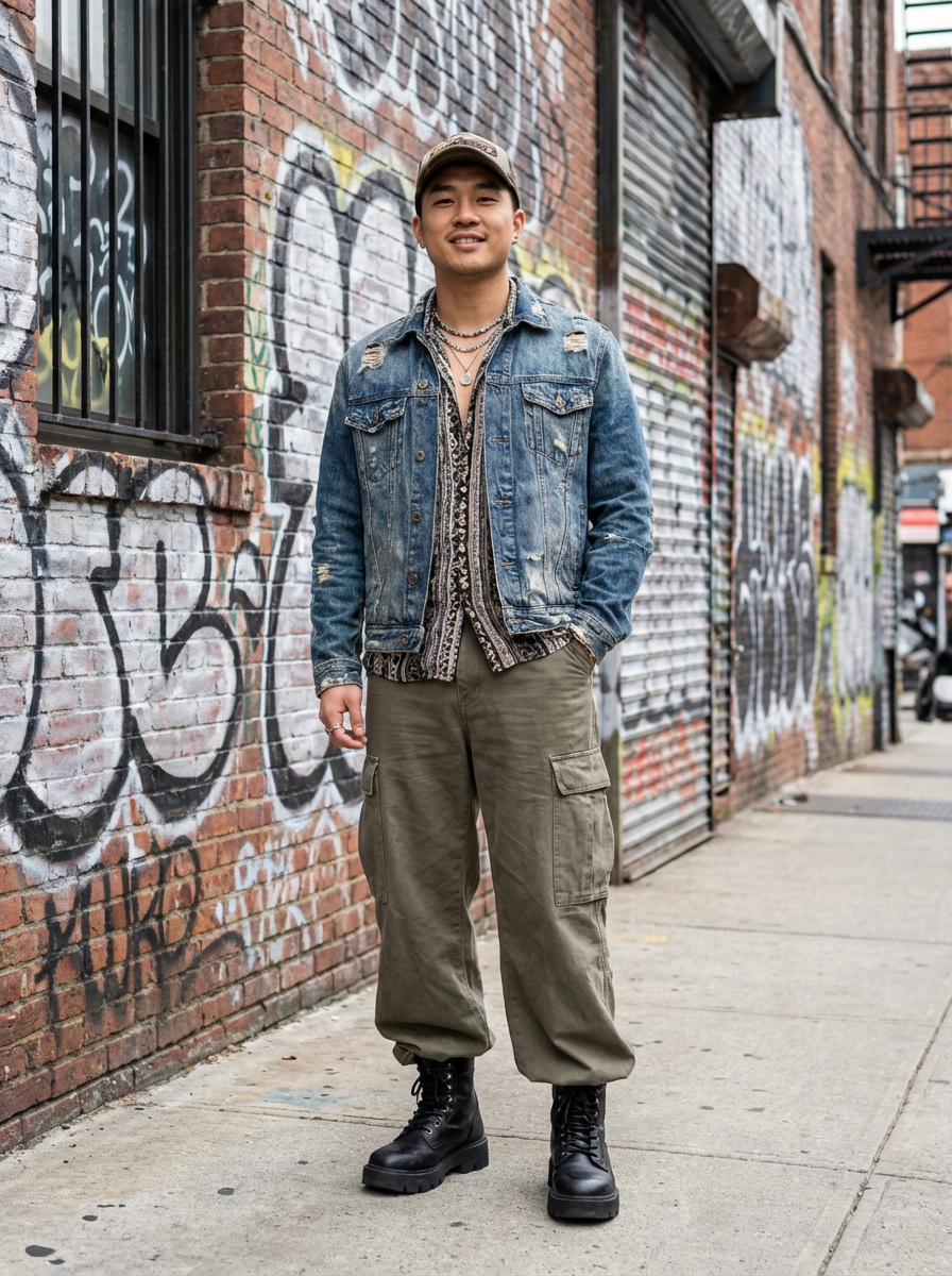 model in stylish alternative fashion, confident self-expression, urban artistic background