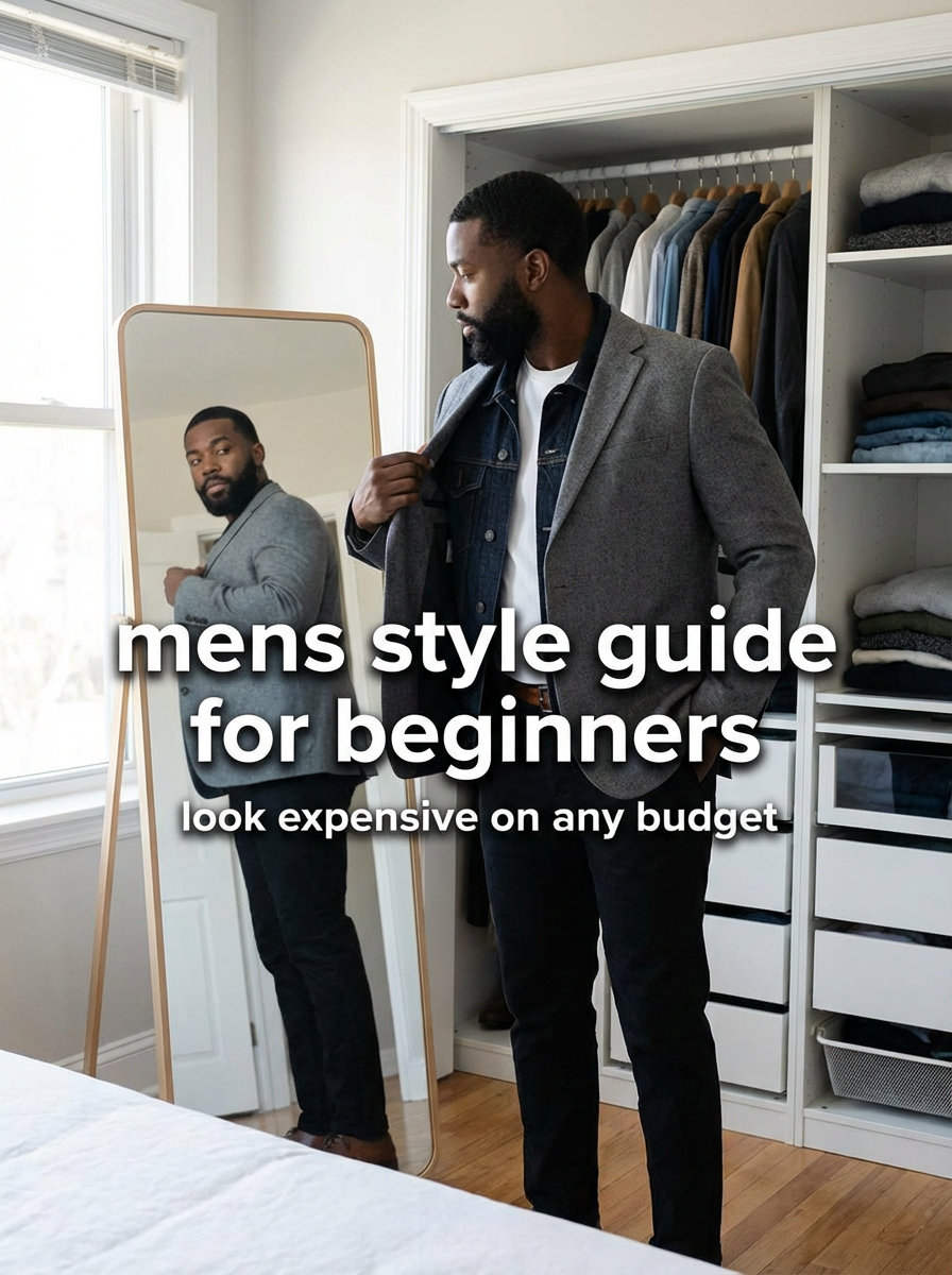 model in stylish casual wear in bedroom with organized closet, trying on clothes, natural lighting. TikTok text overlay: "mens style guide for beginners" smaller text: "(look expensive on any budget)", do not show tiktok interface