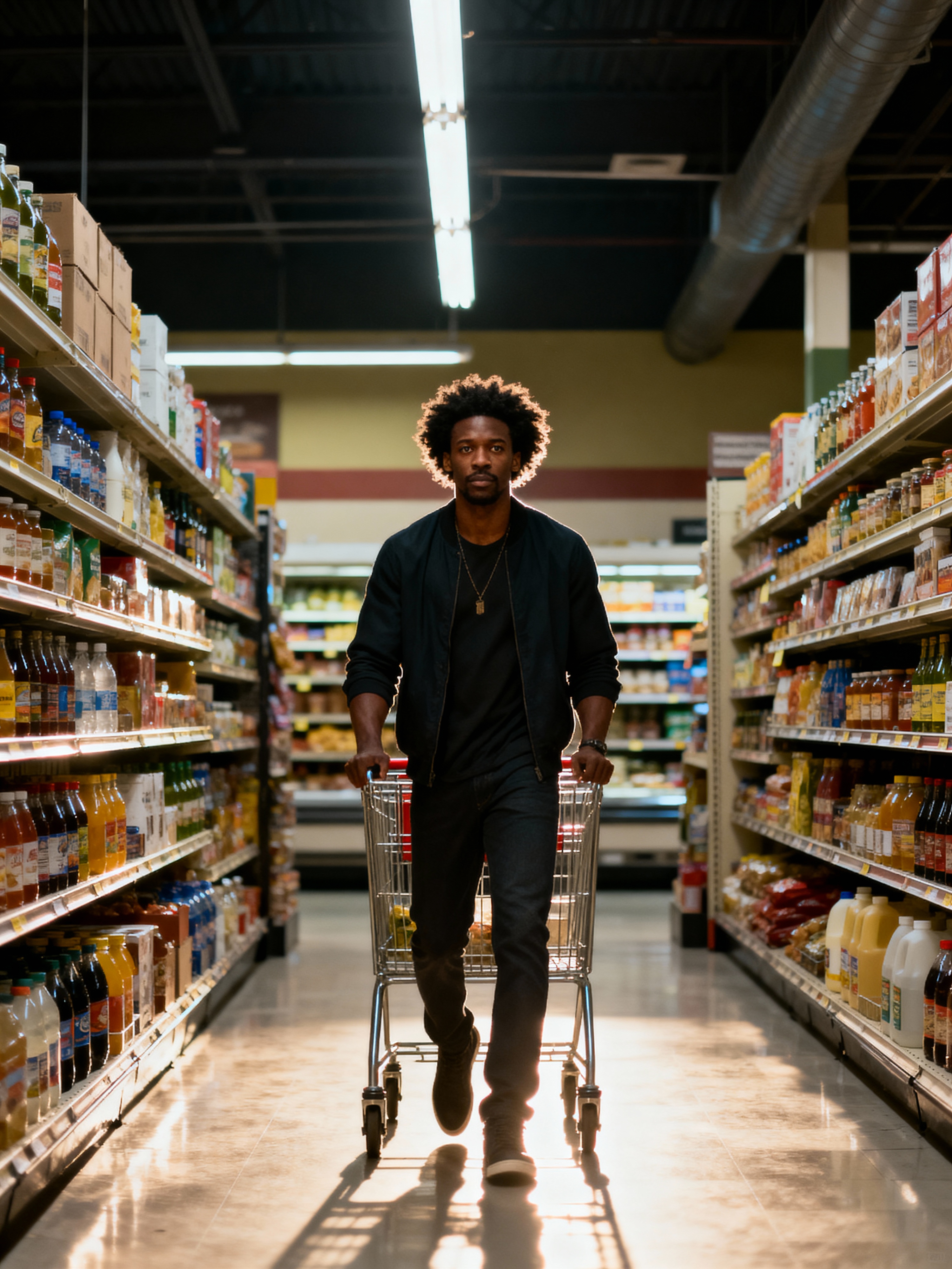 model in Supermarket walking with Shopping Cart in the Supermarket Aisle. Background of Supermarket