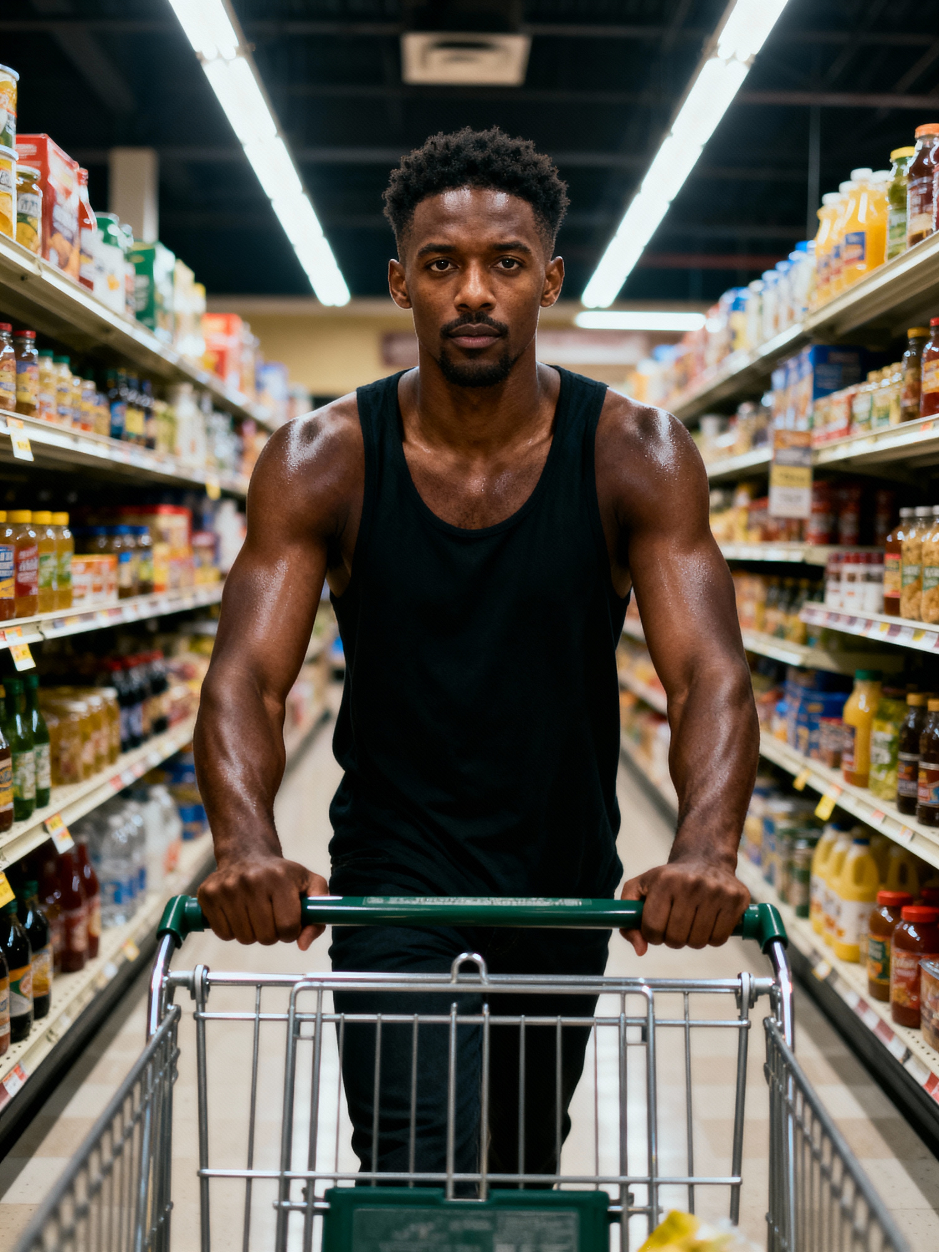 model in Supermarket walking with Shopping Cart in the Supermarket Aisle. Background of Supermarket