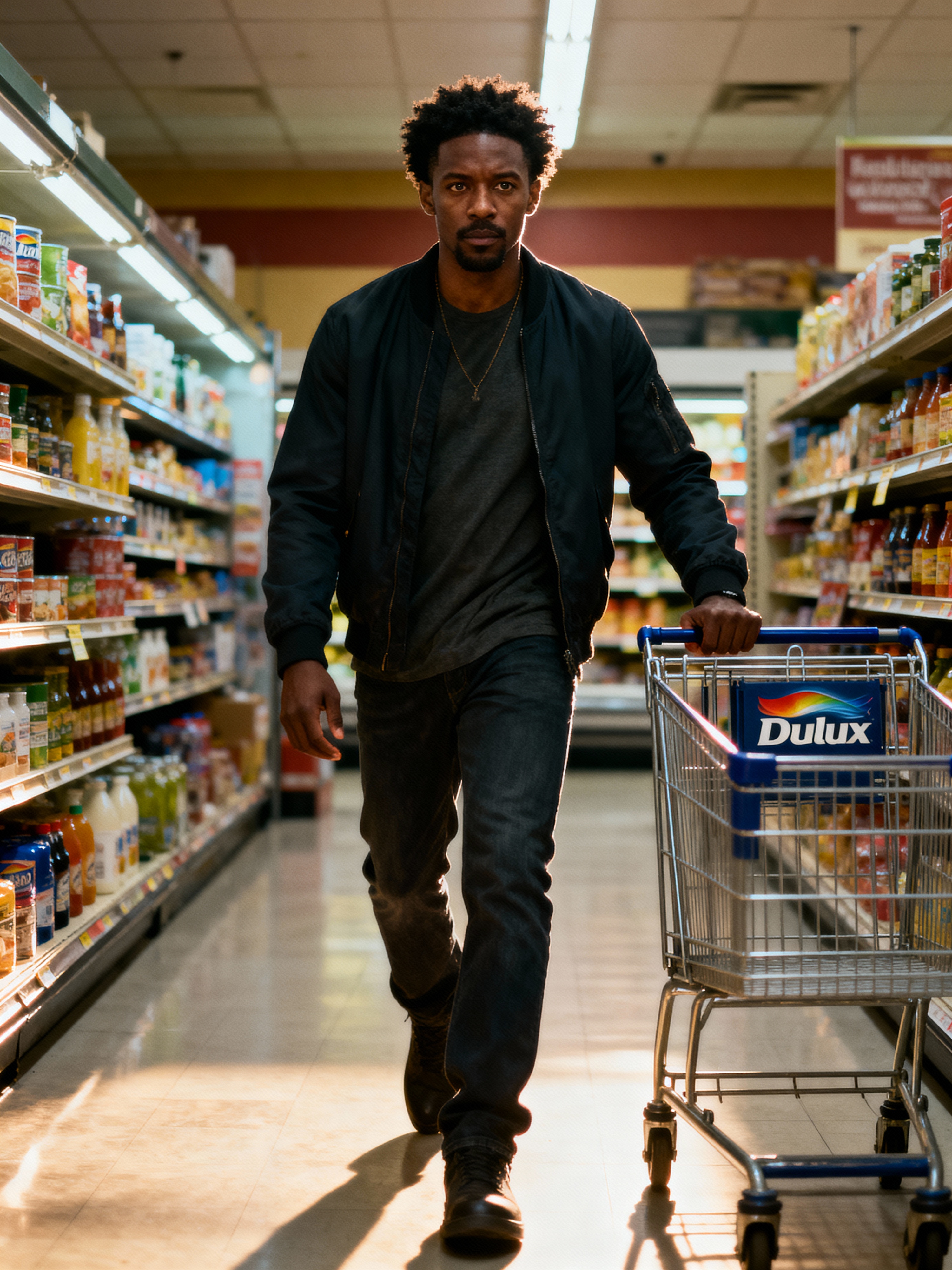 model in Supermarket walking with Shopping Cart in the Supermarket Aisle. Background of Supermarket
