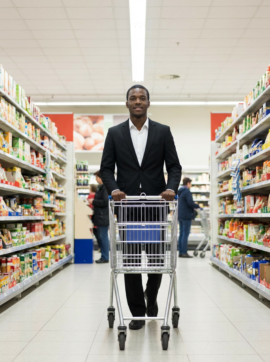 model in Supermarket walking with Shopping Cart in the Supermarket Aisle. Background of Supermarket