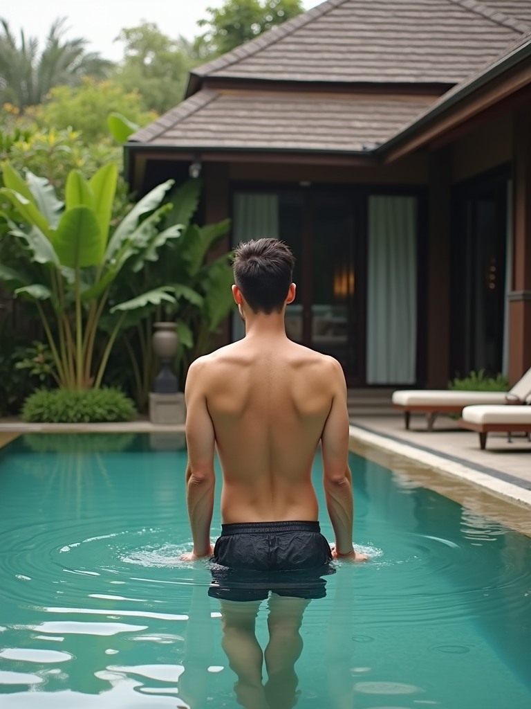 model in swim shorts in modern Canggu villa with floating breakfast in private pool, surrounded by tropical gardens