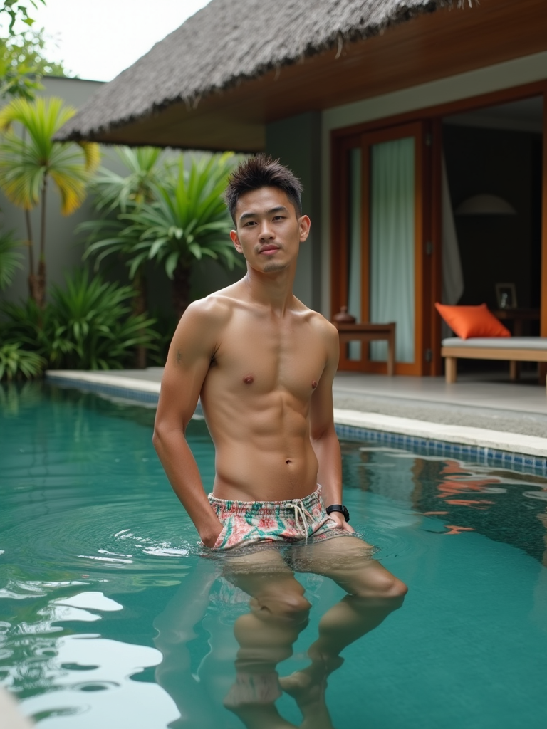 model in swim shorts in modern Canggu villa with floating breakfast in private pool, surrounded by tropical gardens