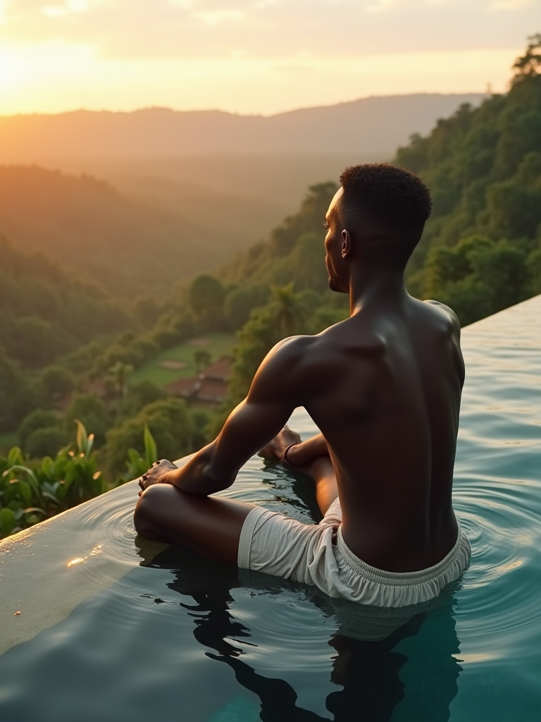 model in swim shorts lounging on edge of infinity pool overlooking jungle and rice terraces in Ubud, golden hour lighting