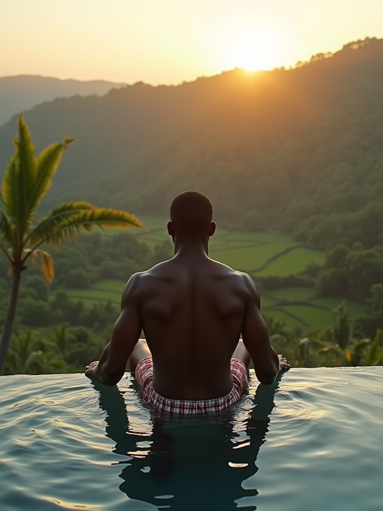 model in swim shorts lounging on edge of infinity pool overlooking jungle and rice terraces in Ubud, golden hour lighting