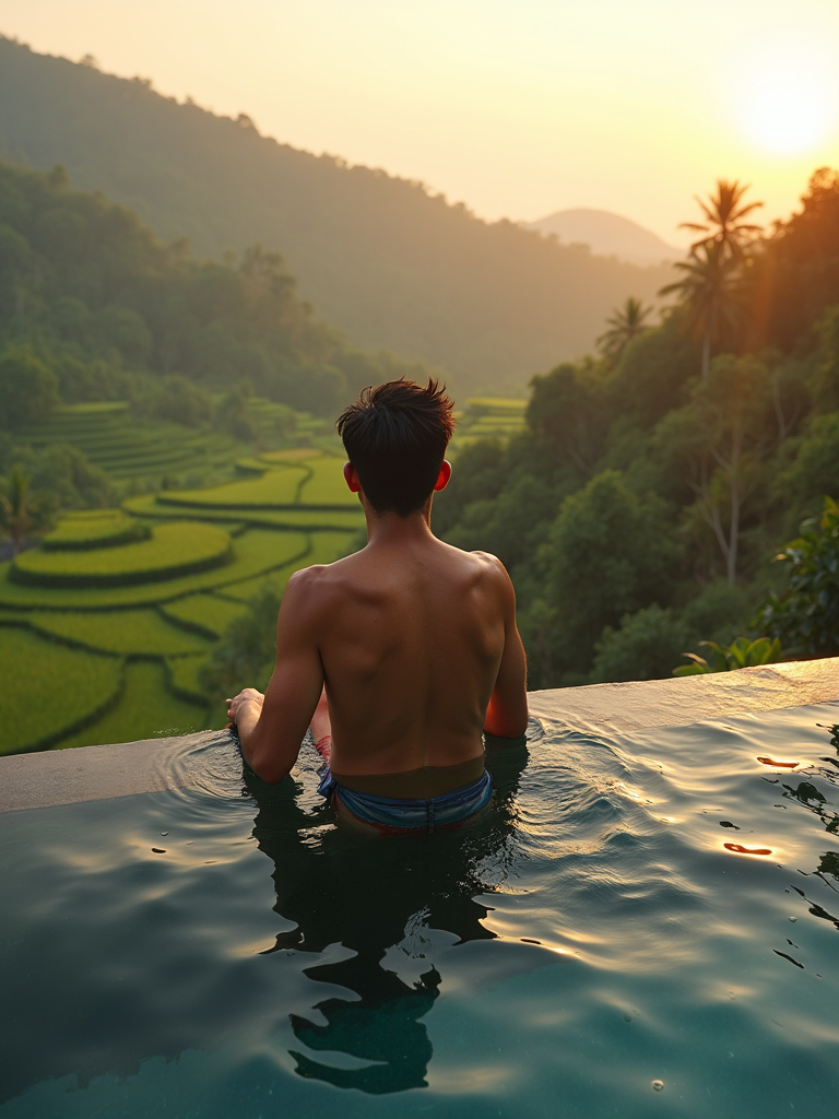 model in swim shorts lounging on edge of infinity pool overlooking jungle and rice terraces in Ubud, golden hour lighting